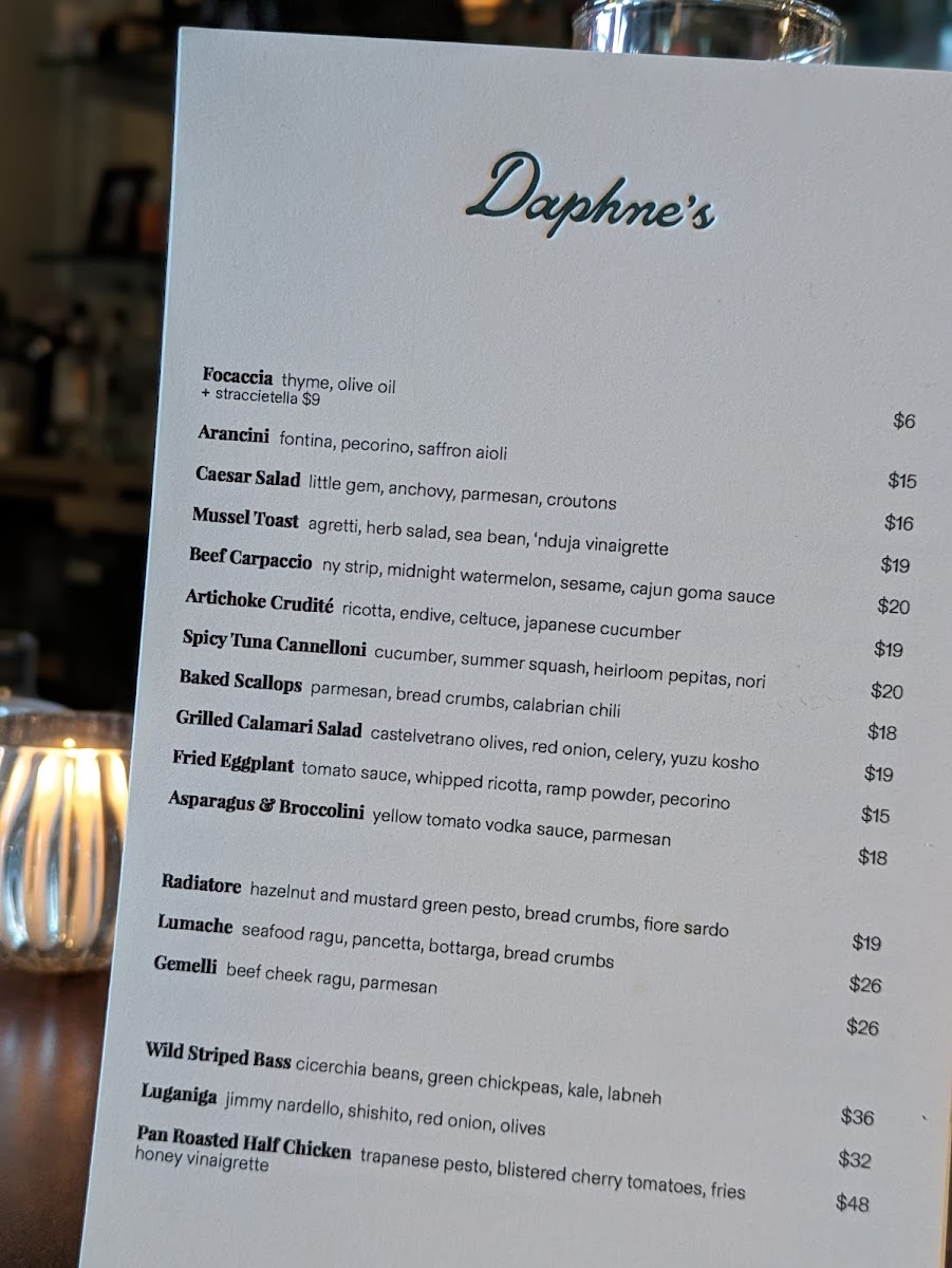 The ambiance is modern and inviting, making it an ideal spot for date nights or casual gatherings. With the talented kitchen team and attentive staff, Daphne's promises a memorable dining experience that keeps patrons returning for more.